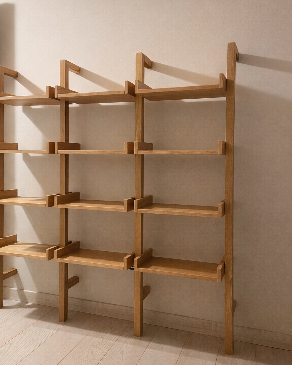 Qui il progetto si addolcisce nelle proporzioni e nella composizione. L’armadio a tutta altezza in finitura chiara crea una superficie uniforme e silenziosa, mentre la libreria e la scrivania in rovere introducono calore e continuità materica.